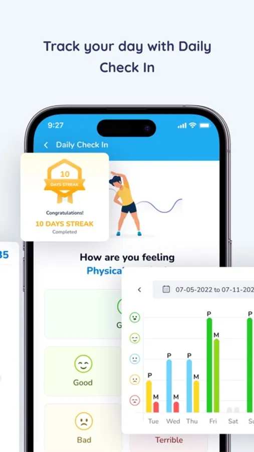 • Daily Check-In creates a daily opportunity for reflection on how you're feeling physically and mentally that can be shared with the community or saved just for you