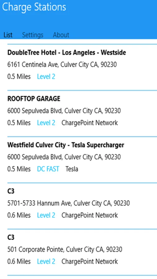 This app will locate open public electric (EV) charging stations closest to your current location. You can specify a Charge Type, such as DC Fast, or Network, such as Chargepoint. A zip code can also be used to search in a desired location. After clicking a station, a map is shown with voice guided directions.