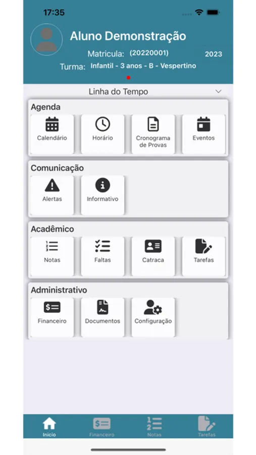 Comunicados, Notícias, Eventos, Calendário Escolar, Financeiro com emissão de Boletos, Notas, Frequência, Ocorrências, Tarefas, Conteúdos, Área exclusiva para publicações do Professor, além de uma Linha de Tempo que mostra os próximos eventos são funções encontradas neste aplicativo.