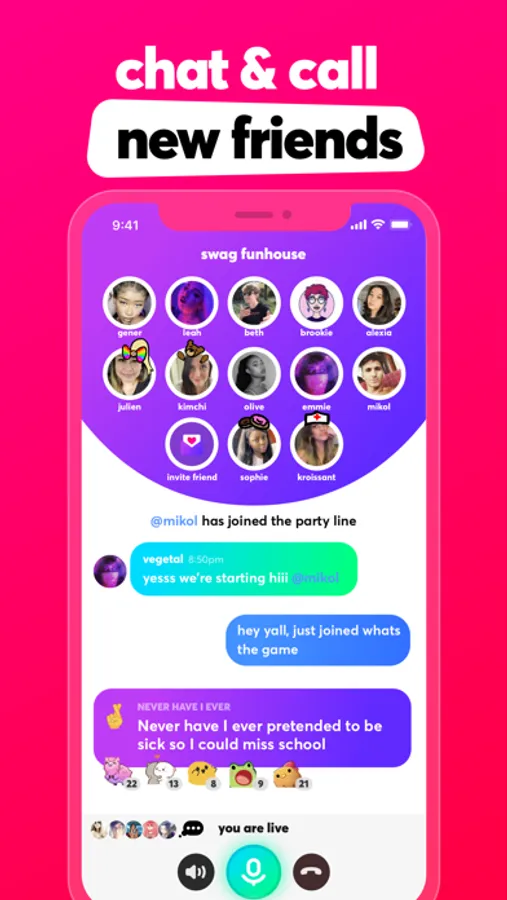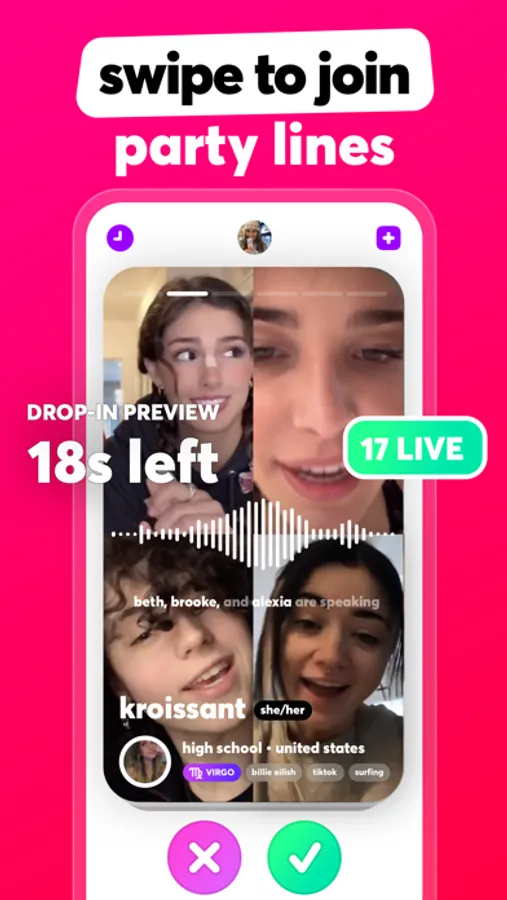 Drop in and preview voice chats with groups of new people that match your age and interests, and join in on the conversation to start talking and meet new friends.
