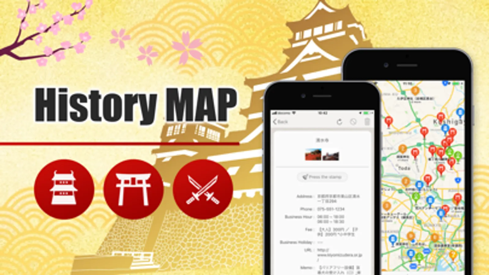 All pins registered on the map, such as castles, shrines, and historical sights, are navigated by GPS from the current location. In addition to walking, it also supports train and car movement, so you can go around the sights by your favorite means of transportation.