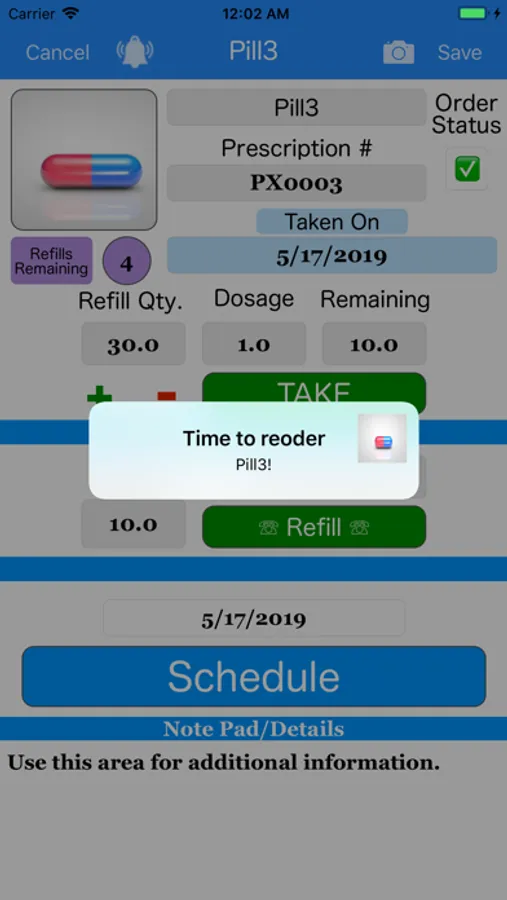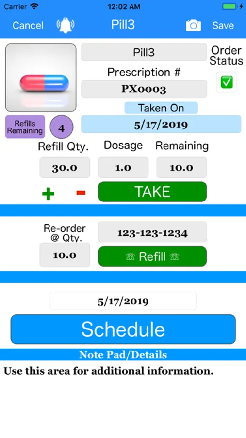Medz is a reminder app. It allows you to schedule alerts and notifications. It keeps track of dosage/pill, refill quantities and automatically sends an alert when your remaining quantities reach your set customized level. Date and time of the most recent scheduled medication taken is stored and displayed on the main page. All your medications are conveniently stored in one customizable list. You may use an image from your photos library or camera to customize your list. A note pad is available for storing additional information. No ads.