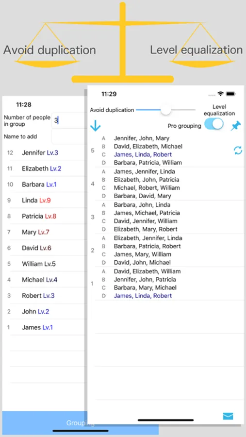 The slider at the top of the grouping list screen allows you to adjust the weight balance of level equalization and duplication avoidance.