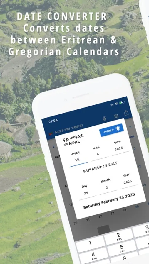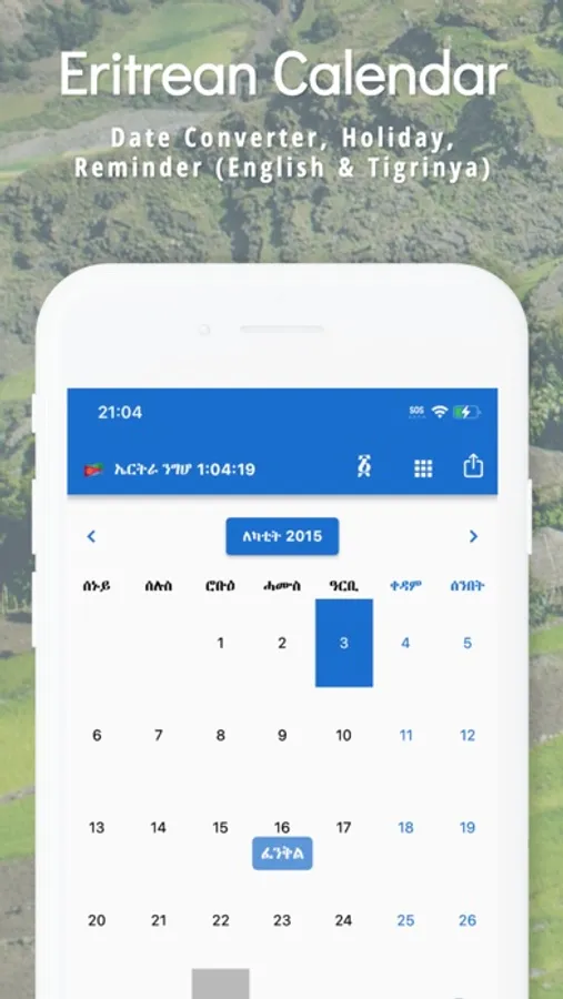 You can add Birthdays of your friends and families to get notified in advance. Convenient utilities such as a Calculator, Todo List, Notes, Amharic and Tigrinya Translator, World Clock and Alarm are included