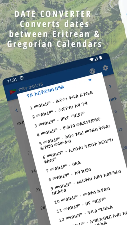Eritrean Calander with Orthodox holidays & fasting days. Date Converter and National holidays are included. Eritrean Calendar has Time Converter that converts the time from Ethiopian local time to your timezone and vise versa.