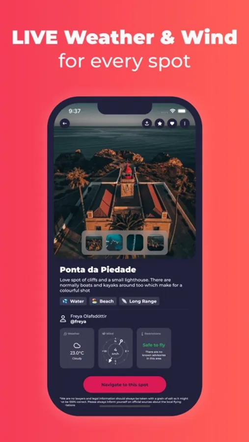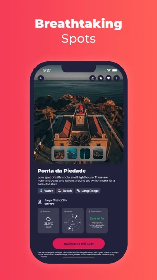 spotfindr helps you find awesome drone spots right next to you or across the globe. Never know where to fly your drone or where people get their spots from? Now you have your answer: spotfindr. Have a spot you want to share but don't know where? spotfindr got you covered. Download the app, sign in and just add it. Our review process, which is done by real humans, makes sure that only high-quality places are being added.