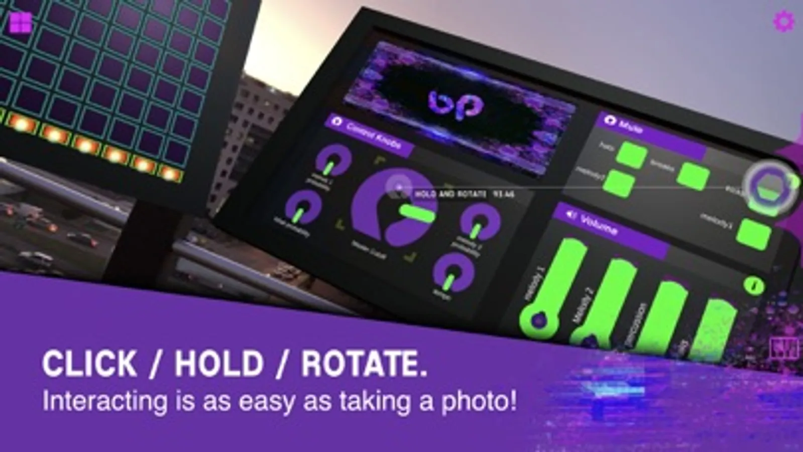 The music interface mechanics have been designed with great care to ensure that only one hand is needed to play. With a click/hold/rotate gesture, users are able to manipulate music parameters mapped to the sound patch. Many more improvements in this pursuit will be released as time goes on.