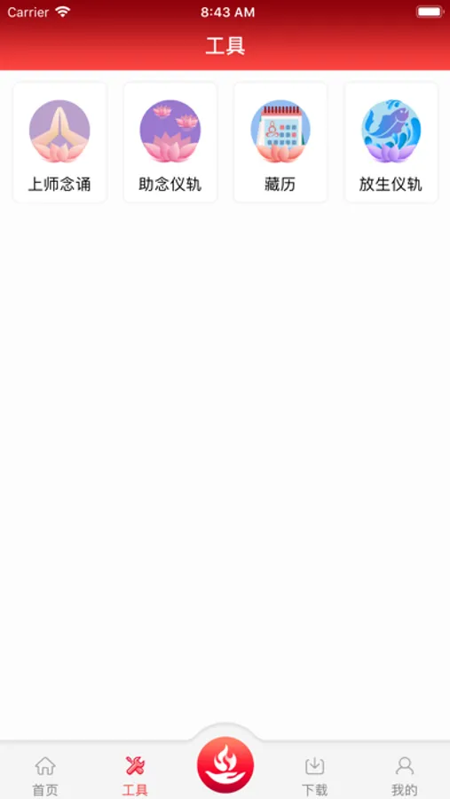 实用的工具栏,包含慈诚罗珠堪布亲诵音频、助念仪轨、藏历查询、放生仪轨等。