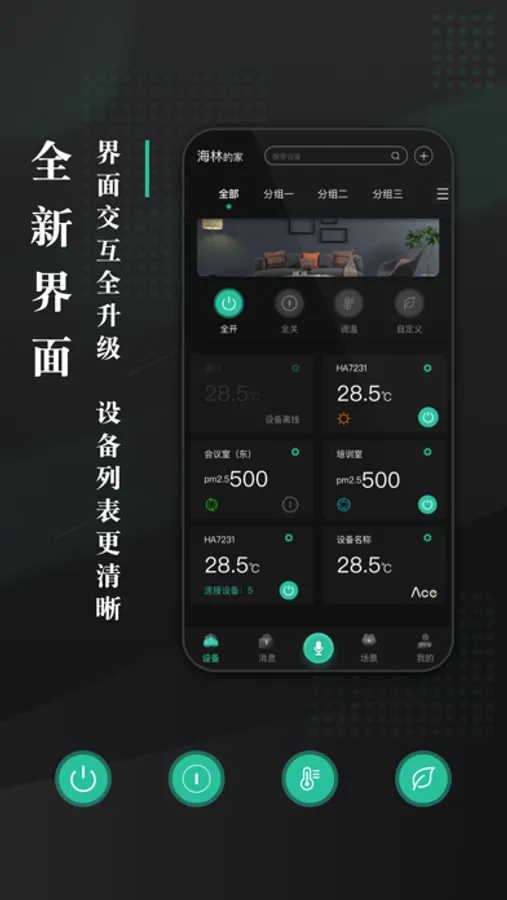 将安装在建筑物内的传感设备通过WIFI连接到互联网,通过云服务将数据分享到APP程序中,使用户在任何时间、任何地点都能看到、控制自己关心的数据,这些数据包括室内PM2.5、CO2、VOC、温湿度等。