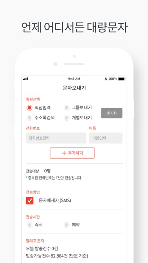 • 문자보내기 : 핸드폰만 있으면 언제 어디서든 대량문자를 보낼 수 있습니다.