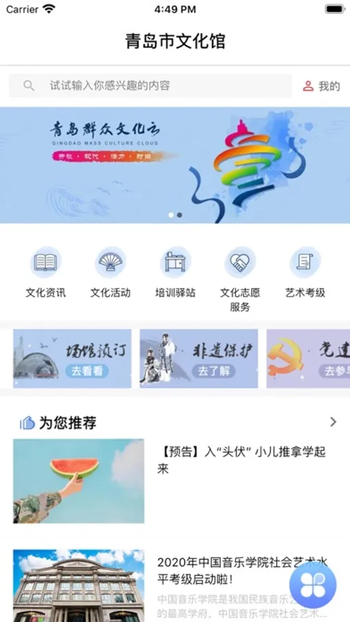 青岛市文化馆是一款聚焦公共文化服务领域,提供公众文化生活和消费的互联网平台,现汇集青岛市全部文体活动,场馆资源。平台集中活动预约,空间展示,文化慕课,艺术鉴赏,等功能为公众提供便捷和有品质的文化生活服务