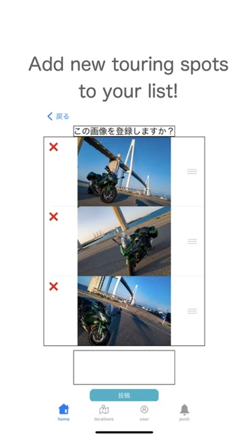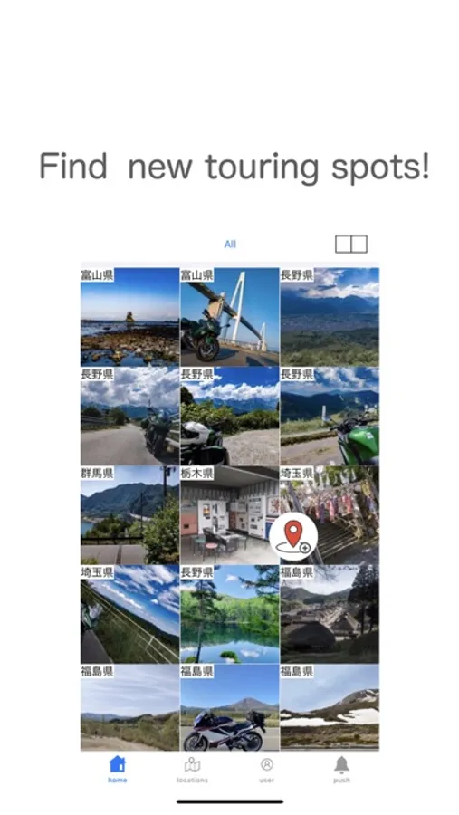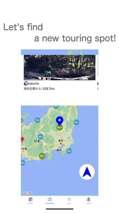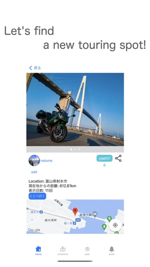 Touring Spot Share is an app for travelers and motorcyclists to share and discover great touring spots around the world.