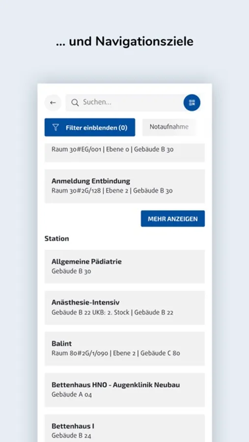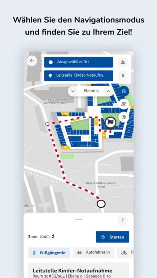 Benutzen Sie unsere App, um sich schnell auf unserem Gelände zurechtzufinden. Lassen Sie sich erst zum Parkplatz oder direkt zum Zielort navigieren. Wir begleiten Sie von Ihrer Haustür aus bis zum Terminort.