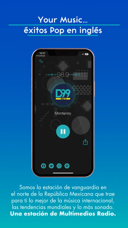 Somos la estación de vanguardia en el norte de la República Mexicana que trae para ti lo mejor de la música internacional, las tendencias mundiales y lo más sonado del rock, pop, dance, R&B y Hip-Hop. Solo éxitos comprobados. Transmitiendo desde Monterrey, México para el mundo entero. D99 - 98.9 FM. Una estación de Multimedios Radio.