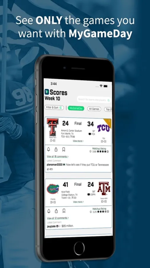 • Filter games by rank, kickoff time, conference, game rating, and more