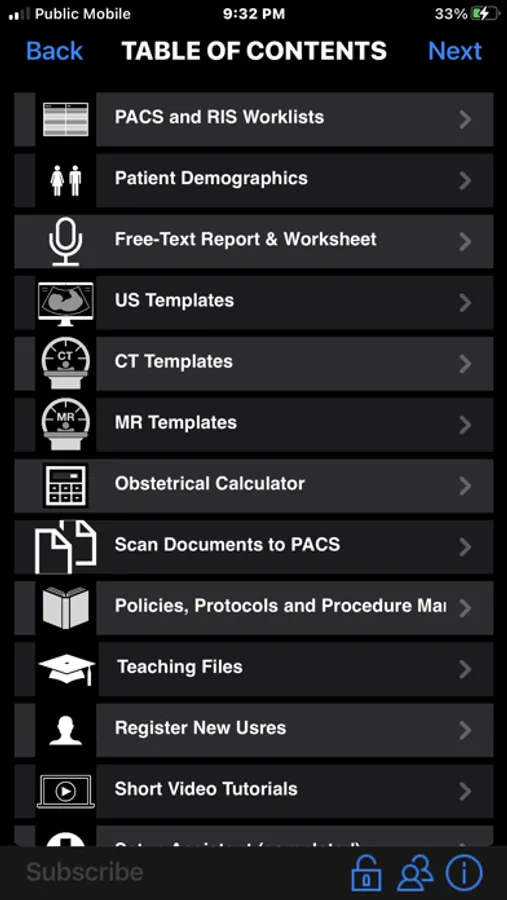 With any subscription model, you will have full access to all features and you can register unlimited number of users. All of your devices in your department or your entire healthcare will have exactly the same reporting templates with latest list of technologists, radiologists, worksheet diagrams, your institution header banner, office policies, protocols, procedure manuals and teaching files. You only pay a low subscription fee no matter how many devices you install the app on. And if you update a policy or add or remove a user from the app, all of your devices will instantly be updated safely from iCloud with the latest information.