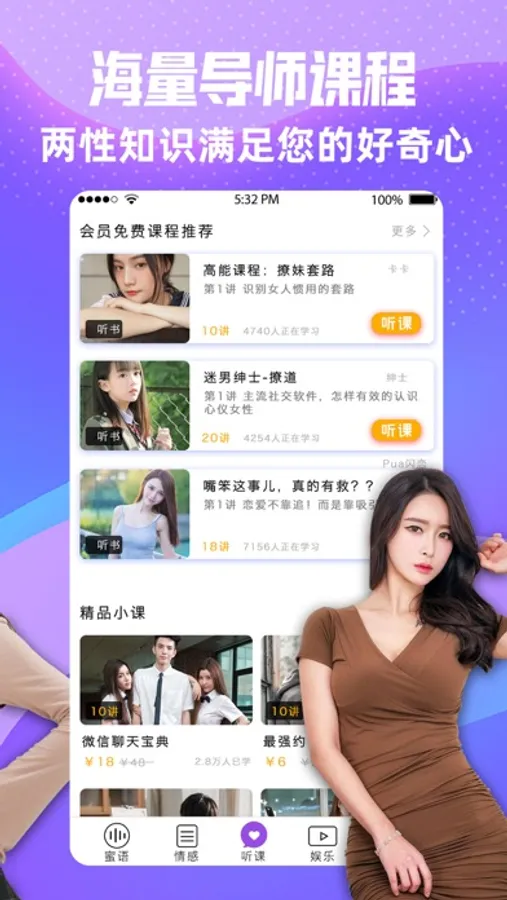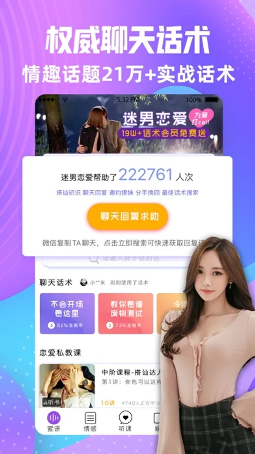 Chat assistant, a magic app that allows you to have a sweet talk with goddess and God. More than 20W + script library, search for N + excellent replies for your choice; more domestic gold medal tutors open courses, emotion master online Q & A, to protect your love emotion.