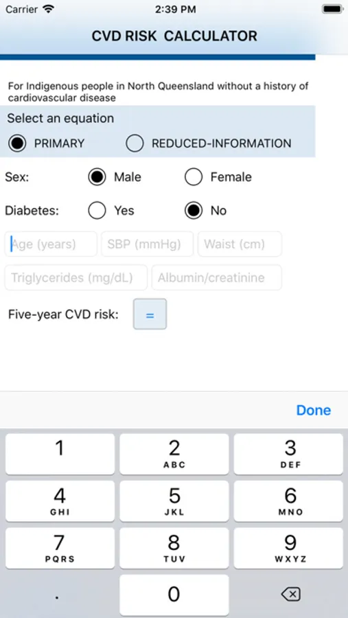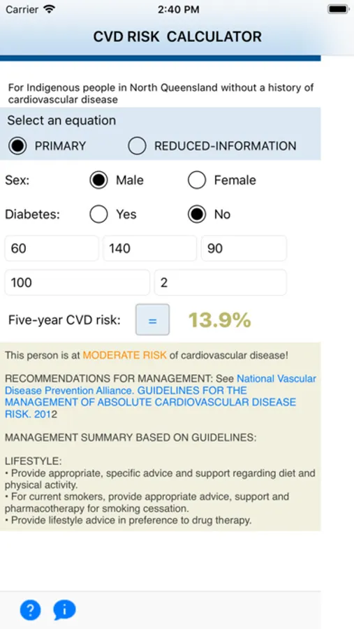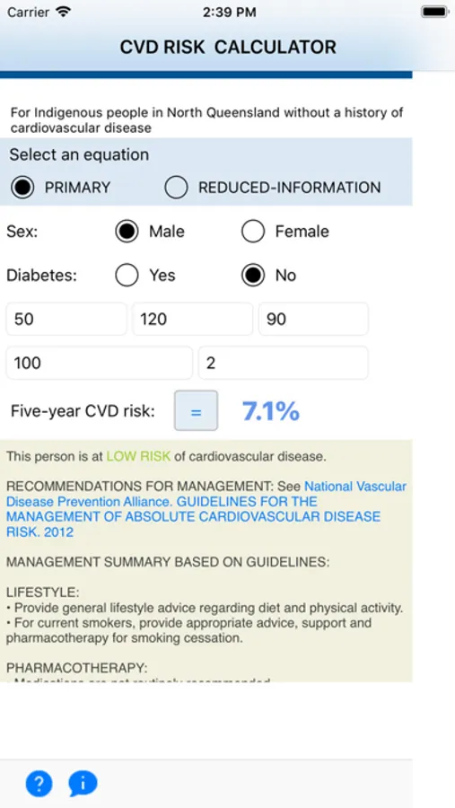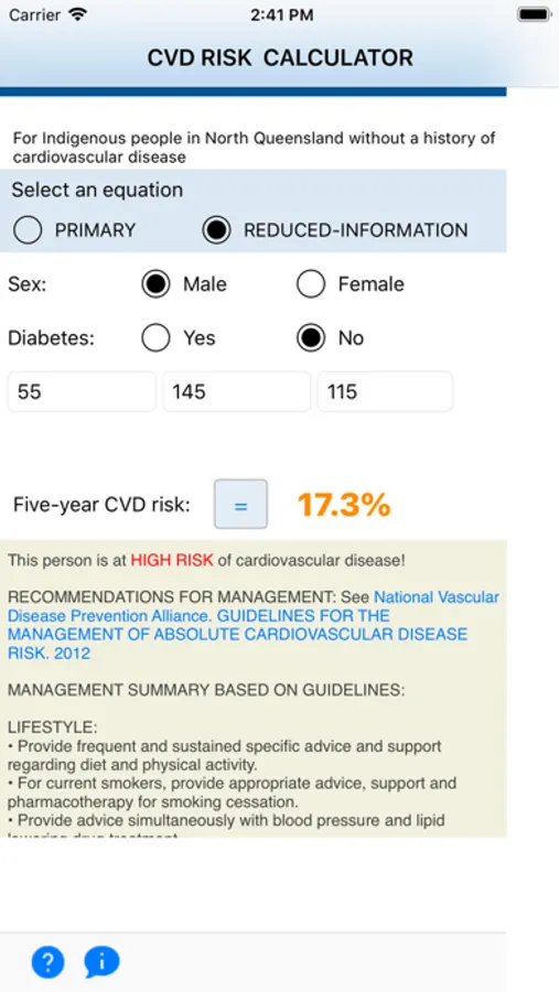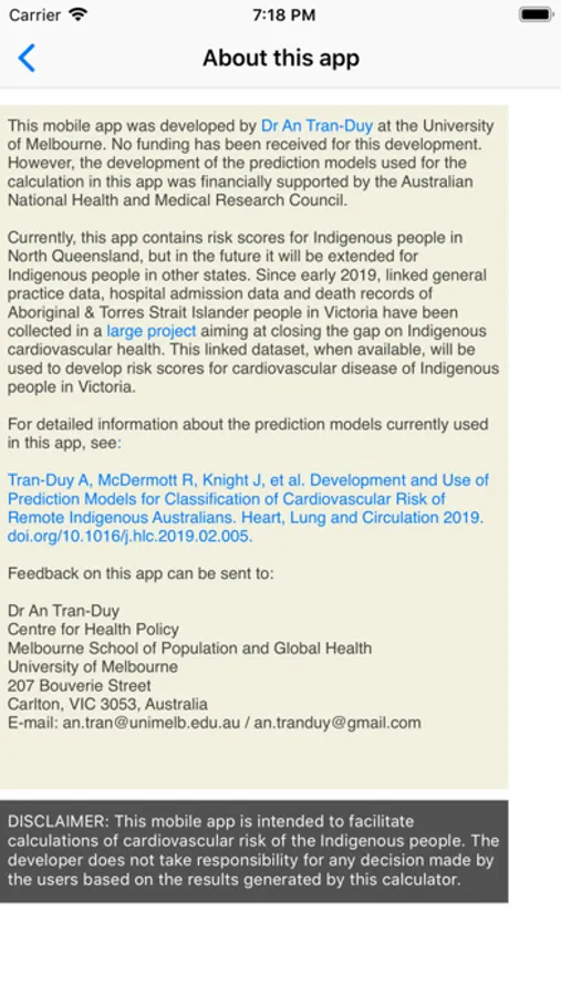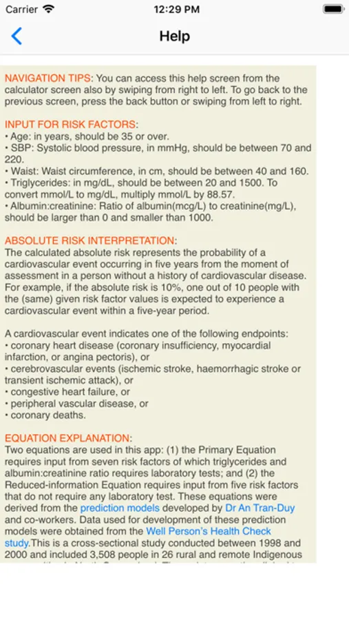 This app helps to estimate the absolute five-year cardiovascular risk of Indigenous Australians and stratify the assessed person as one with high, moderate or low risk. A summary of guidelines for management of cardiovascular risk is provided based on the calculated risk. Two equations are used in this app: (1) the Primary Equation requires input from seven risk factors including sex, diabetes, age, systolic blood pressure, waist circumference, triglycerides and albumin:creatinine ratio; and (2) the Reduced-information Equation requires input from five risk factors that do not require any laboratory test. These equations were derived from the prediction models developed by Dr An Tran-Duy (developer of this app) and co-workers, which have been internally validated in an Indigenous cohort in North Queensland, Australia.