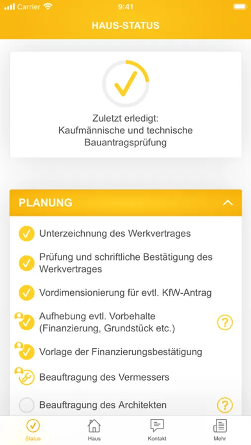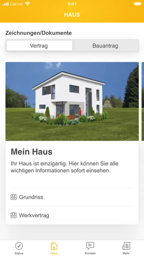 Mit der Mein Haus Bauherren-App das neue Traumhaus direkt in der Tasche tragen – so sind Sie immer auf dem neuesten Stand. Die App verrät Ihnen, in welcher Phase sich der Bau Ihres Büdenbender-Hauses gerade befindet: Planung, Produktion oder Errichtung. Besonders im Planungsprozess müssen zahlreiche Aufgaben und Schritte erledigt werden. Wurde der Architekt beauftragt? Gibt es mittlerweile einen Wärme- und Schallschutznachweis? Wurde der Keller schon erstellt? Was wird aktuell im und ums Haus errichtet? Dank der App erhalten Sie alle wichtigen Informationen und können trotz Abwesenheit genau verfolgen, wie Ihr zukünftiges Haus mehr und mehr Form annimmt. Mein Haus achtet jedoch auch auf alle wichtigen Aufgaben, die Ihrerseits erledigt werden müssen. Stehen die Beauftragung des Vermessers oder Begleichung der ersten Abschlagsrechnung zum Beispiel noch aus, so erhalten Sie direkt eine Erinnerung – dadurch können Sie ganz einfach planen und alle wichtigen Schritte nacheinander abarbeiten. Sie möchten Ihren Freunden und Kollegen Ihr zukünftiges Haus präsentieren? Neben Informationen zu den aktuell laufenden Prozessen hält die App auch Ansichten und Grundrisse bereit – einfach direkt über das Smartphone reinklicken.