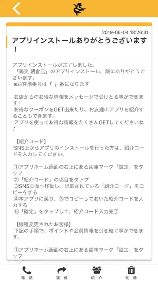 鶏笑 朝倉店のアプリをSNSを通じてお友達に紹介する事ができます。
