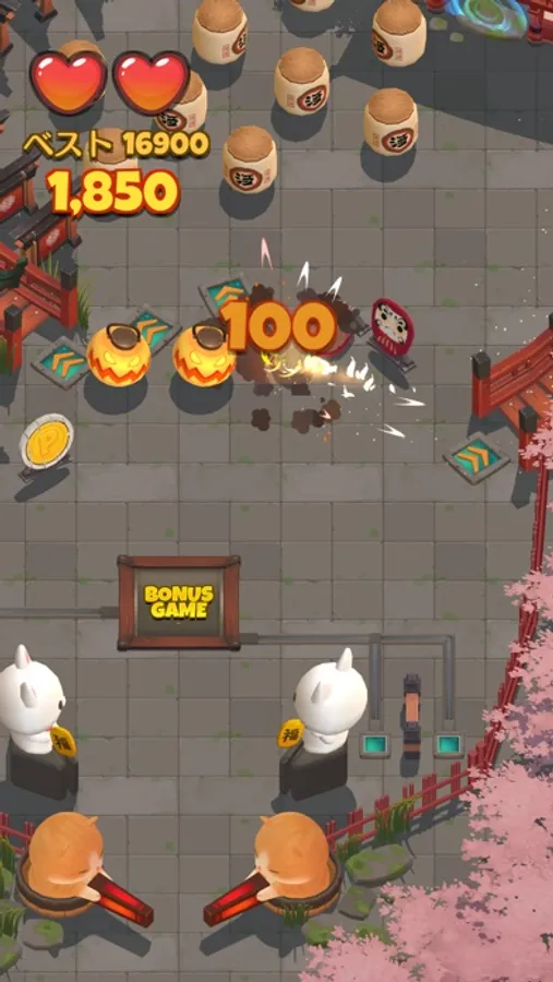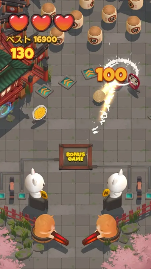 ネコが手に持ったフリッパーを操作して、ボールを飛ばすだけの簡単操作。