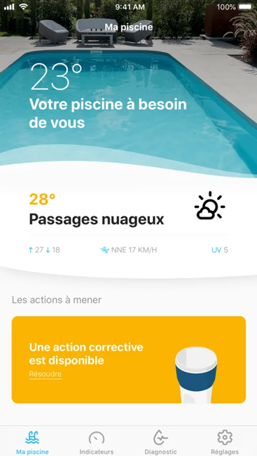 The connected analyzer continuously controls your settings (pH, chlorine and temperature) and communicates them to you via the app on your smartphone.