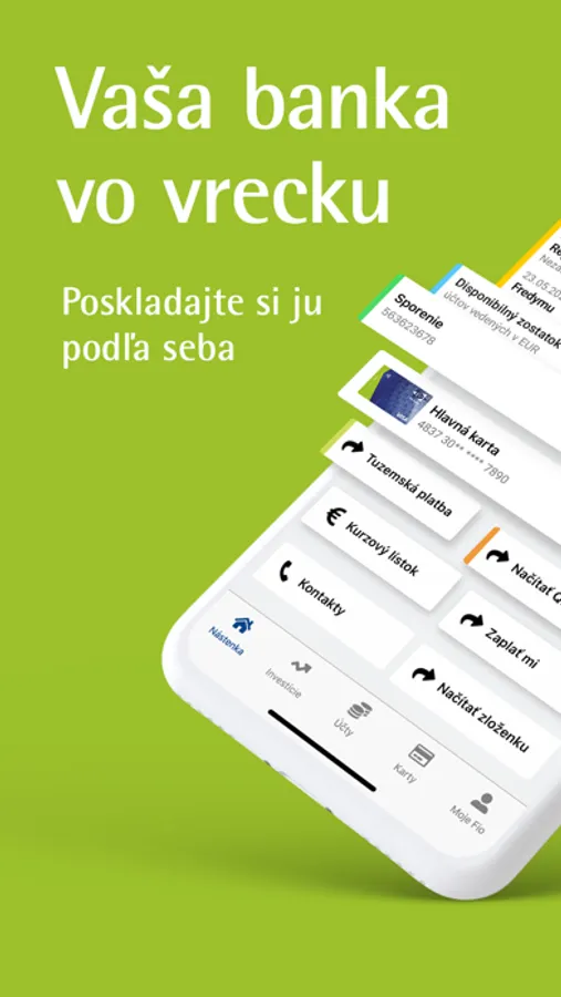 Máte možnosť prispôsobiť si úvodnú obrazovku tak, aby ste videli najpoužívanejšie prehľady a funkcie na prvý pohľad – pridávať účty, karty alebo tlačidla na rýchle zadanie platieb. Účty môžete zoradiť alebo farebne odlíšiť. Notifikácie o pohyboch na účte si môžete nechať posielať priamo na telefón.