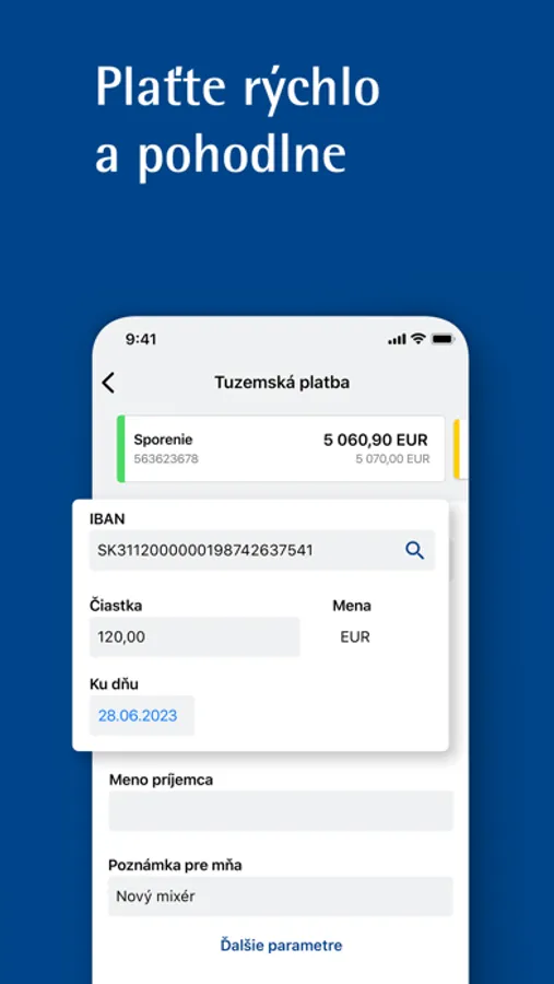 Plaťte vyfotením QR kódu, načítaním zloženky, čísla účtu alebo načítaním obrázku z galérie. Vytvárať môžete QR kódy vďaka funkcií Zaplať mi, spravovať šablóny pre opakované platby aj trvalé príkazy či súhlasy s inkasom. V mobile je možné ľahko a bezpečne potvrdzovať platby kartou online alebo príkazy zadané v Internetbankingu.