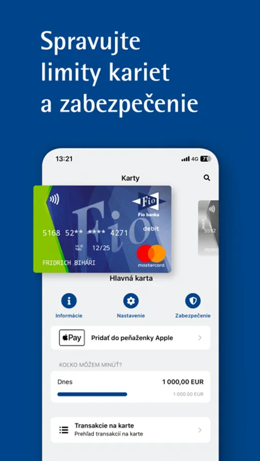 Aplikácia vám umožní kedykoľvek meniť limity kariet a kartu môžete dočasne či trvale zablokovať. Môžete blokovať aj vybrané typy transakcií, napr. tie s nevýhodným kurzom (DDC). Pokiaľ chcete platiť mobilom, kartu si jednoducho pridáte do Google Pay.