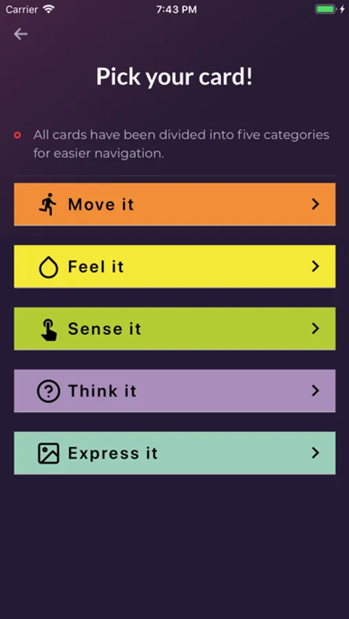 The T-BOX cards are divided into five main categories: Move it, Feel it, Sense it, Think it, Express it, and each card describes the target age of the pupils, duration, materials and preparation time, objective, detailed instructions and useful tips and recommendations.