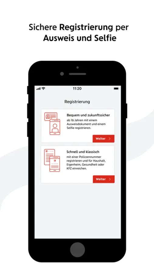 • Registrieren Sie sich einmalig mit einer Ihrer Polizzennummern (z.B. Haushalt-, KFZ- oder Krankenversicherung für ambulante Heilbehandlungen) oder noch einfacher mit einem gültigen Ausweis und einem Selfie.