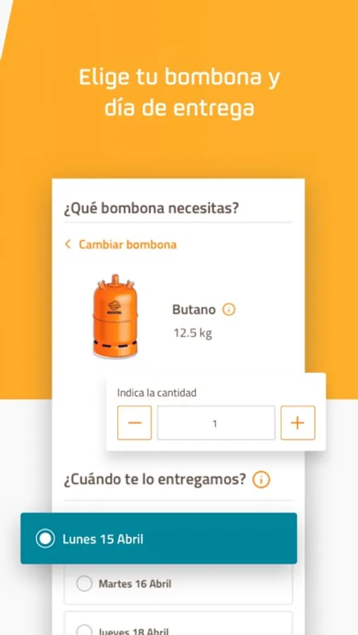 Con esta nueva app queremos mejorar el servicio para pedir tu bombona de siempre y así, hacer tu día a día más cómodo. Podrás seleccionar el producto que deseas, ver su precio y elegir entre varias fechas de entrega según tu dirección. El servicio de pedido online de bombona está disponible en península y Baleares.