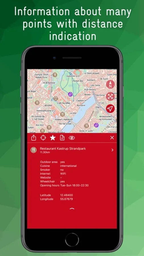 For many POIs there is further information such as opening hours, address, disabled access, ... Notes or favourites can be created for each POI, a history list shows the most recently used POIs, content can be shared.