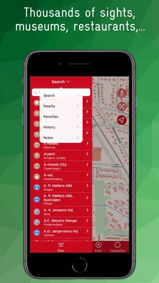 An integrated database allows you to search for POIs as well as a large number of streets, towns, villages, districts, etc. The search can be filtered by category and/or distance.