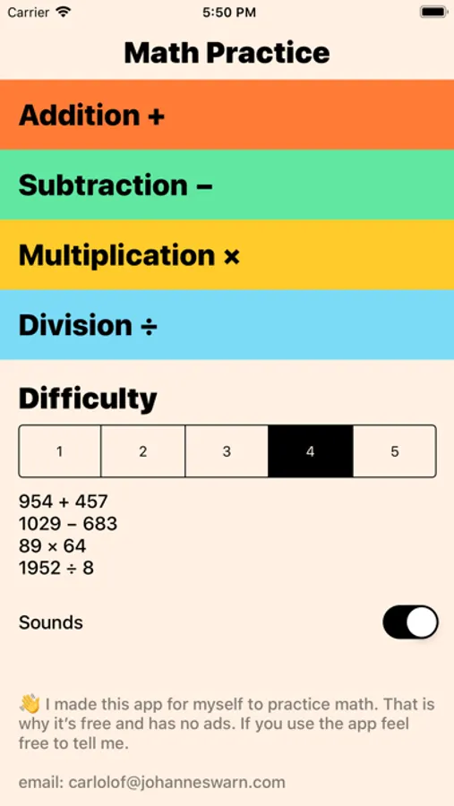 Practice addition, subtraction, multiplication, and division. Start out easy if you want to, then advance through five difficulty levels.