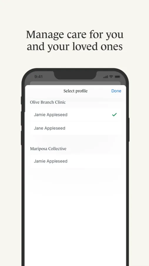 • Profile switching – Quickly toggle between any Client Portal you’re managing—whether you’re seeing different providers who use SimplePractice for practice management or are managing care for multiple individuals.