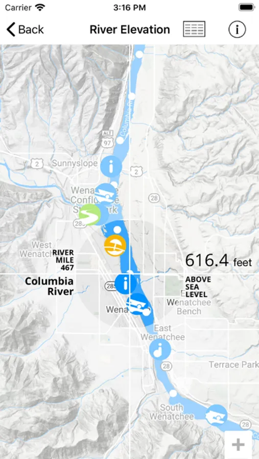 Current is designed by the Chelan PUD to keep recreationist informed of water conditions so they can plan their day on the water. This app provides Lake Chelan lake level information and Columbia River levels (between Wells and Rock Island dams). Estimated river level information is provided at each river mile post and points of interest so users can select the area of the river most relevant to them.