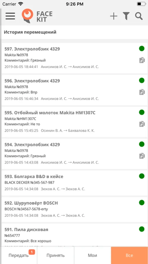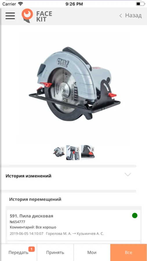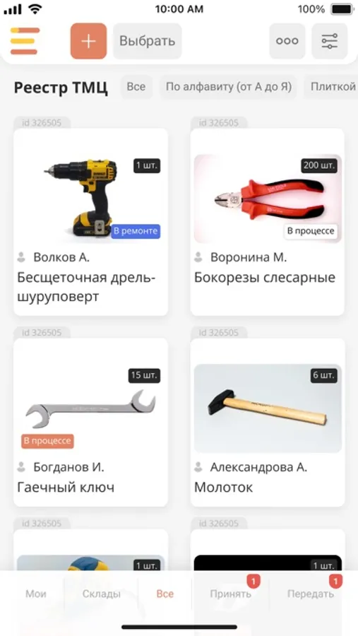 Установив это приложение, вы сможете управлять имуществом компании, передавать от сотрудника к сотруднику или со склада на склад. В любой момент можно посмотреть текущего ответственного за тот или иной инструмент.