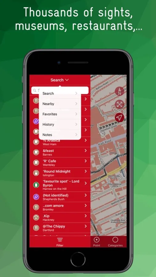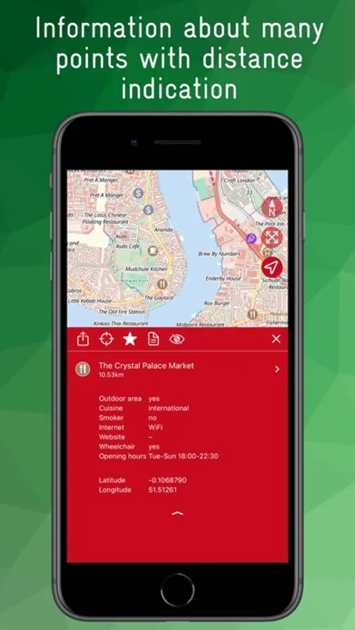 For many POIs there is further information such as opening hours, address, disabled access, ... Notes or favourites can be created for each POI, a history list shows the most recently used POIs, content can be shared.