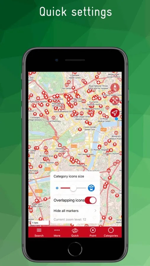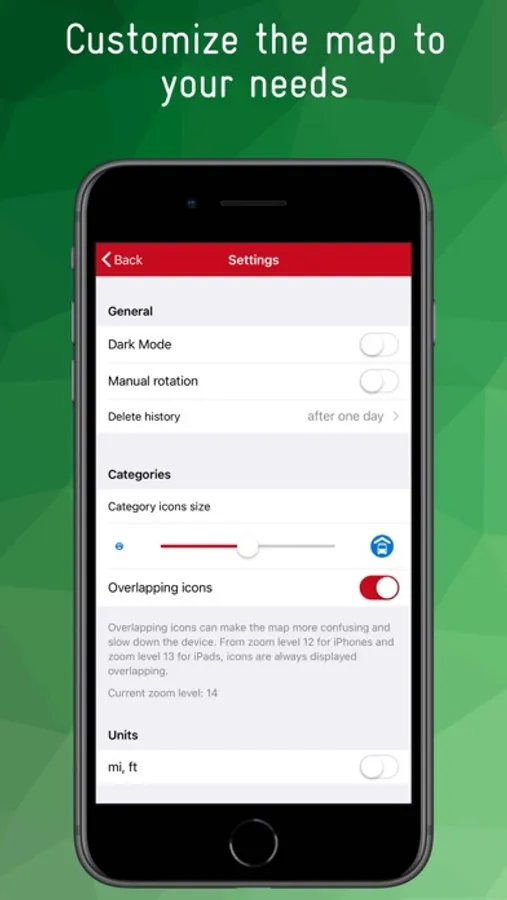 POIs are grouped into categories and can be displayed as layers. For example, you can display all restaurants, public transport lines, banks, hiking trails, charging stations and doctors on the map. The size and overlap of the icons can be adjusted to improve clarity.