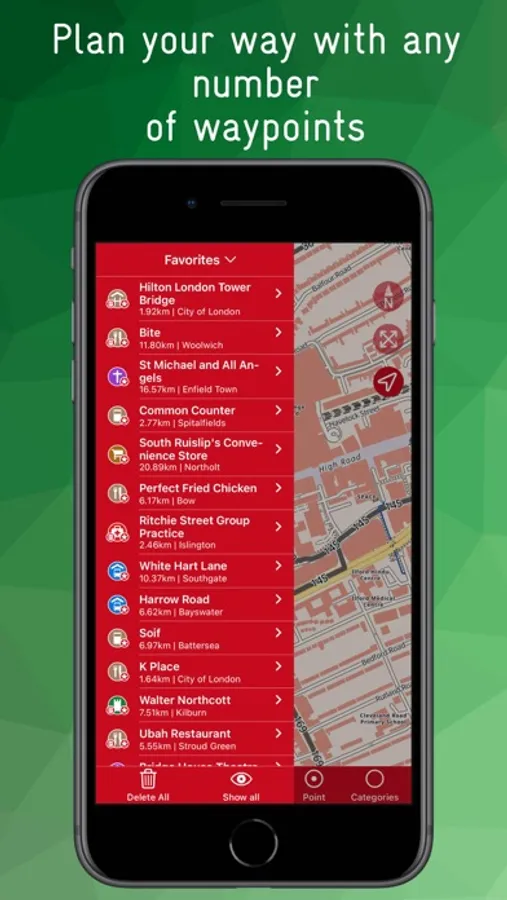 An integrated database allows you to search for POIs as well as a large number of streets, towns, villages, districts, etc. The search can be filtered by category and/or distance.