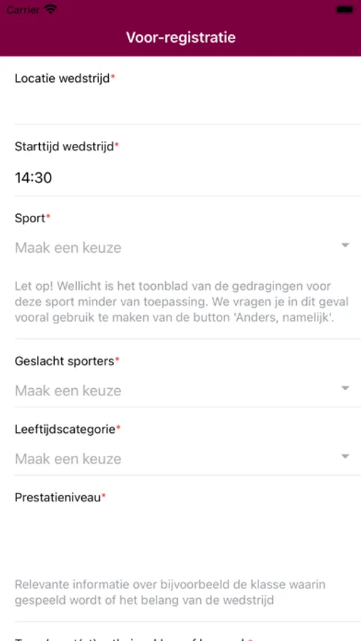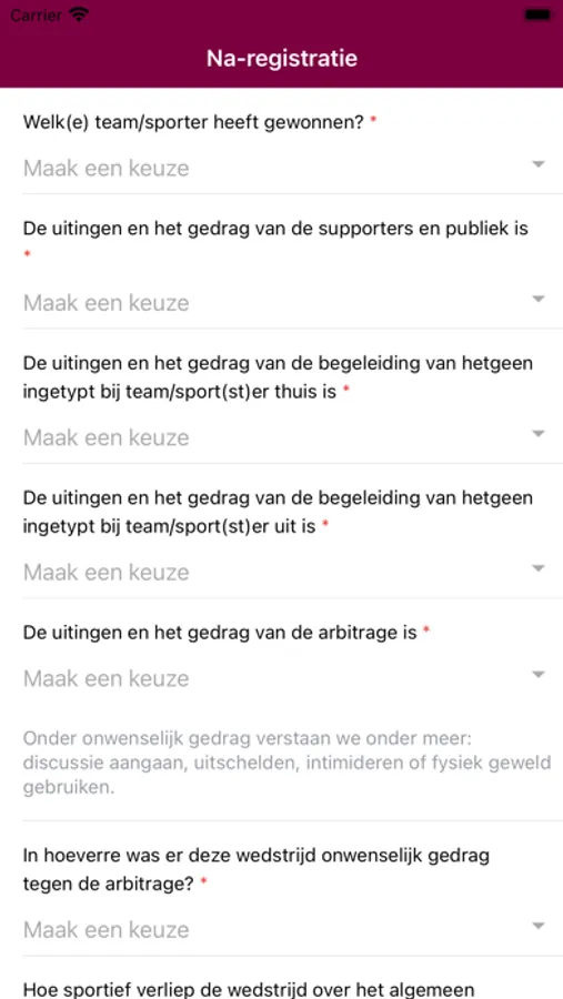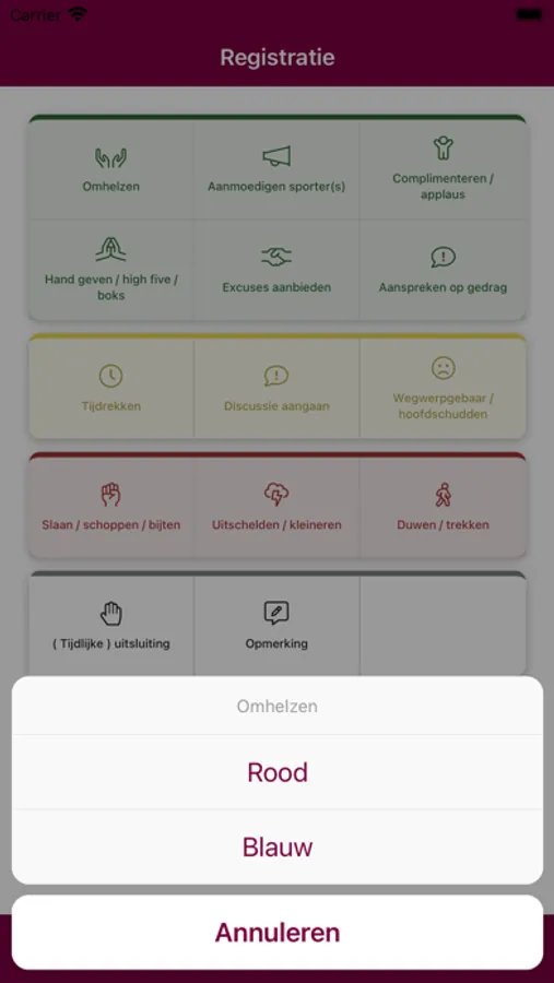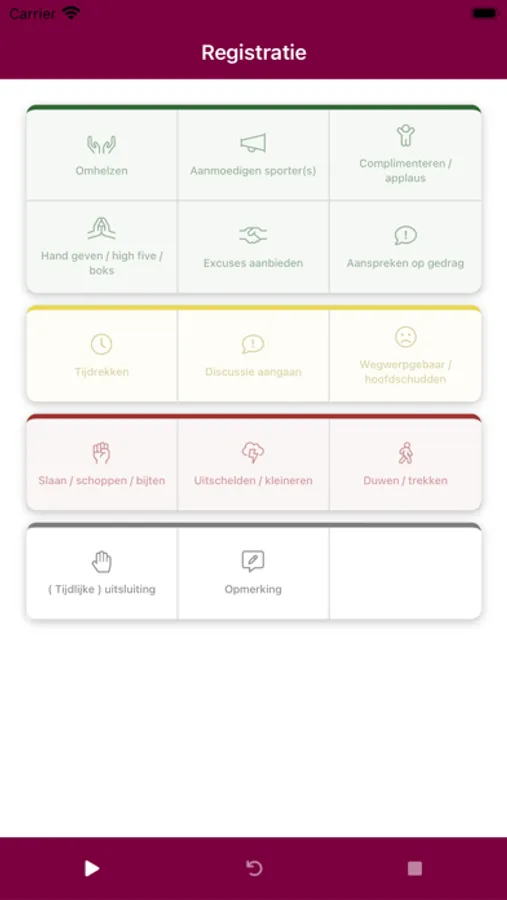 De Sportklimaat App helpt bij het registreren van sportief en onsportief gedrag tijdens sportwedstrijden. Het dashboard met gedragingen maakt het de gebruiker mogelijk om snel en eenvoudig de meest voorkomende handelingen in de wedstrijd te noteren.