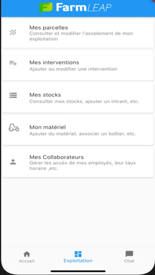 Vos parcelles, vos stocks, vos équipements... Vous pouvez désormais consulter l'intégralité de votre parcellaire depuis l'application FarmLEAP ! Ces informations sont disponibles hors-connexion afin de vous être toujours accessibles ! Rechercher parmi vos dernières interventions, consulter la carte de votre exploitation et ajouter un intrant à votre stock n'ont jamais été aussi rapides !