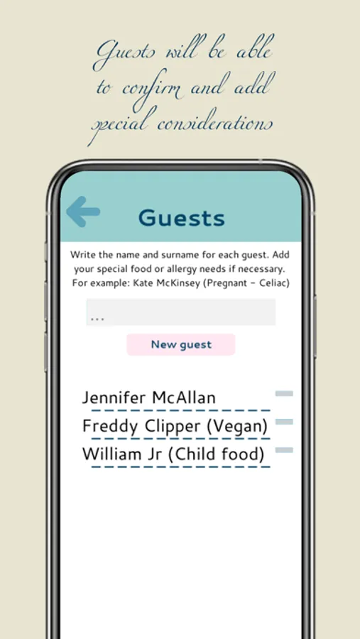 -Confirmation: This is where the guests enter their first and last name, and if they have any allergies or special requests as well. On the website, the bride and groom can download a file with all the names confirmed to attend. Very comfortable!