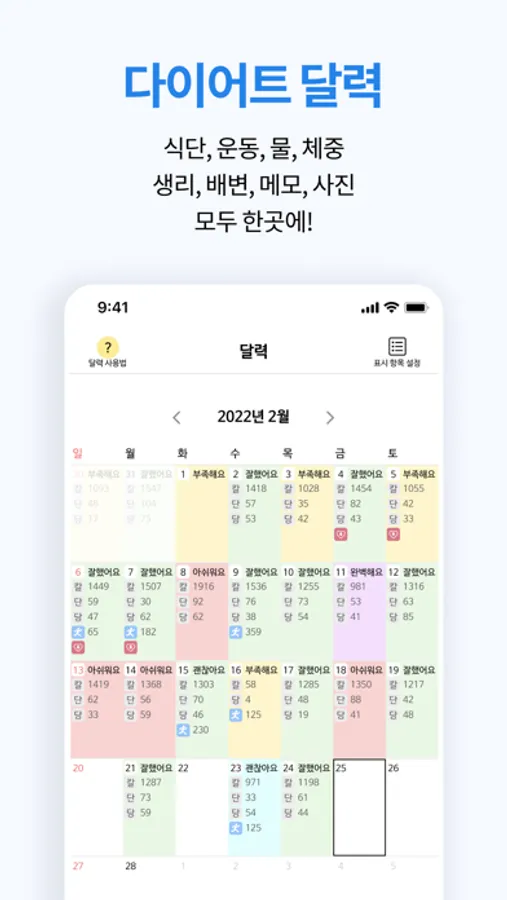 - 달력에서 칼로리, 영양소, 운동, 물, 체중, 생리, 배변, 메모, 눈바디 까지 모두 확인할 수 있어요.