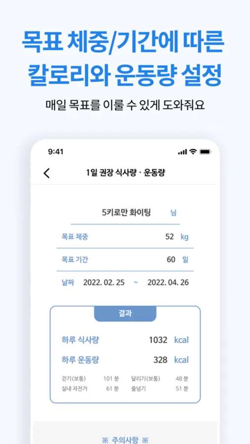 - 목표 체중, 기간만 설정하면 하루 적정 식사량/운동량을 매일 확인할 수 있어요.