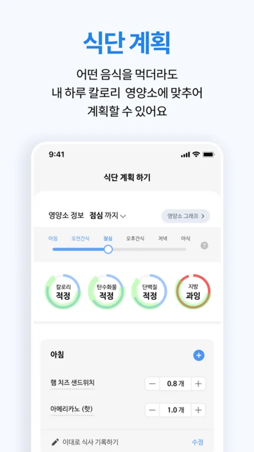 - 식단을 끼니별로 손쉽게 계획하고, 변경할 수 있어요!