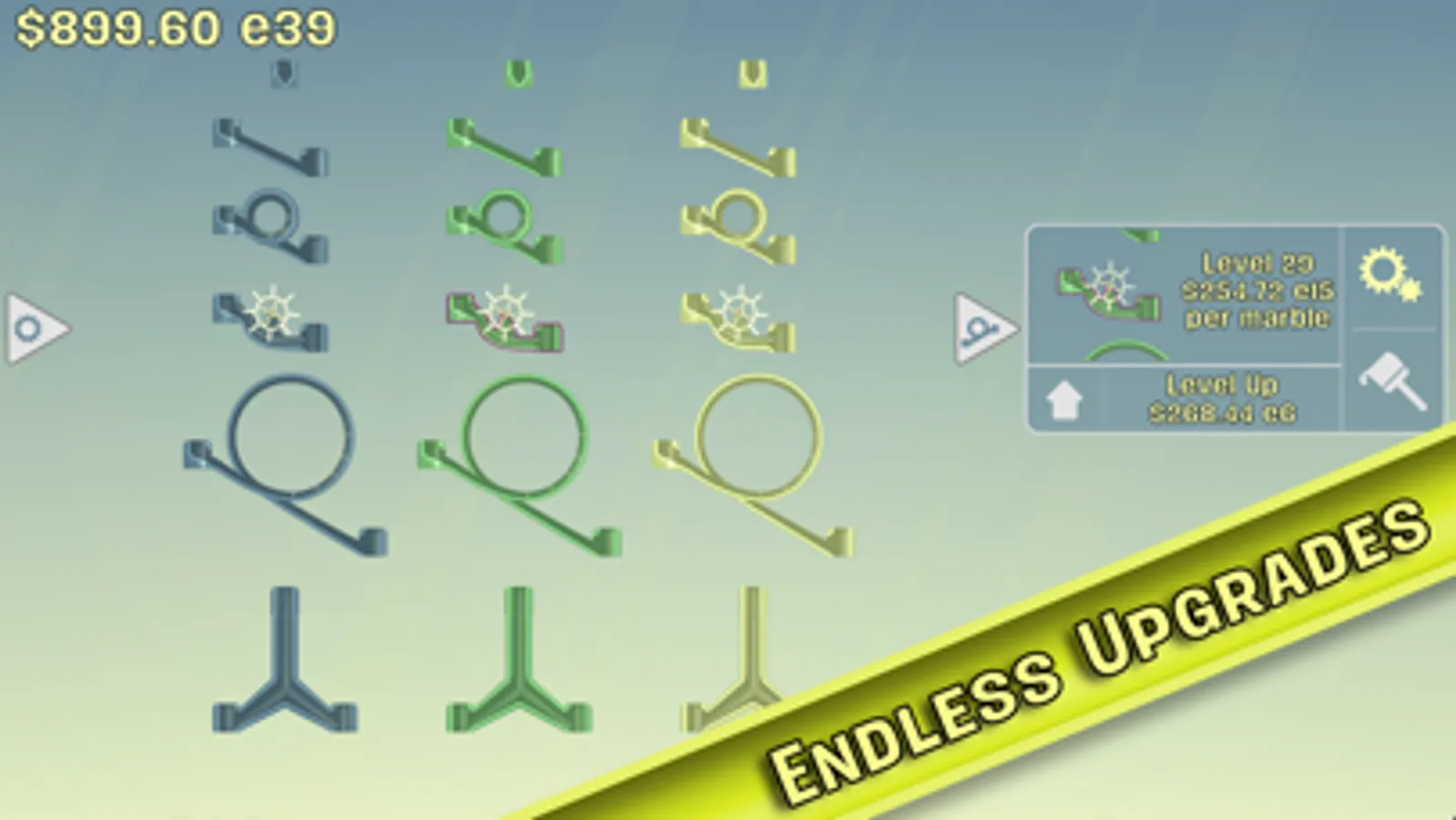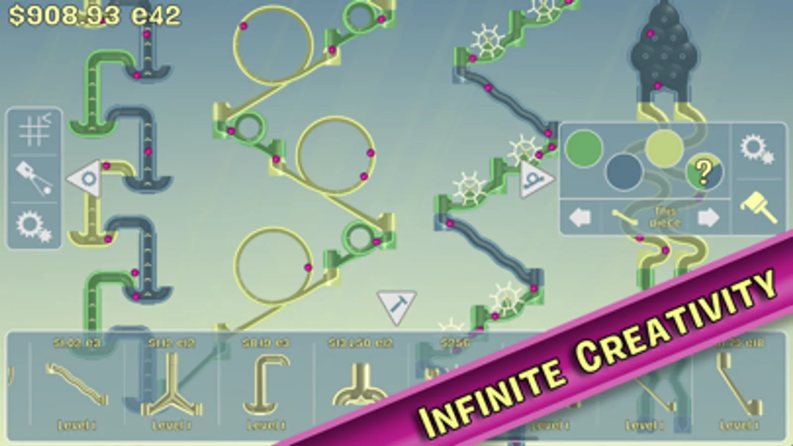 This free to play marble run construction kit with tycoon game trappings lets you build massive marble slide towers using over 30 unique pieces. Enjoy the ASMR rolling and clacking sounds of marbles on plastic. Get mesmerized by the realistic (and sometimes supernatural) physics of a never-ending stream of marbles. Start small, earn money, spend it on upgrades to earn more, build more slides, and create the marble slide world of your dreams!