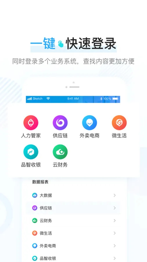 1.使用单点登录方式,集成奥琦玮所有的餐饮系统(包括:收银、供应链、微生活、外卖、人力管家、云财务等),同时亦开放性地支持其他业务系统的接入——您不用再同时登录多个餐饮业务系统,一个App就够了;