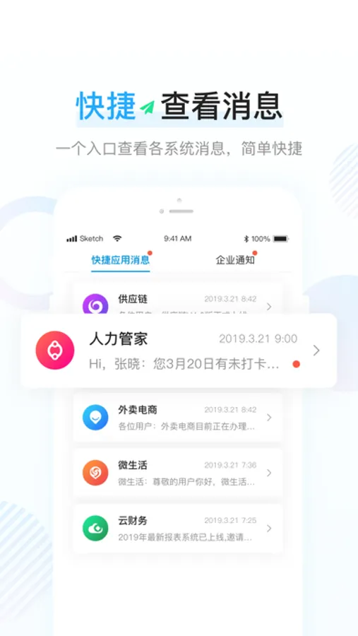 2.支持统一接收各业务系统的消息通知,以及企业发送的消息和通知;